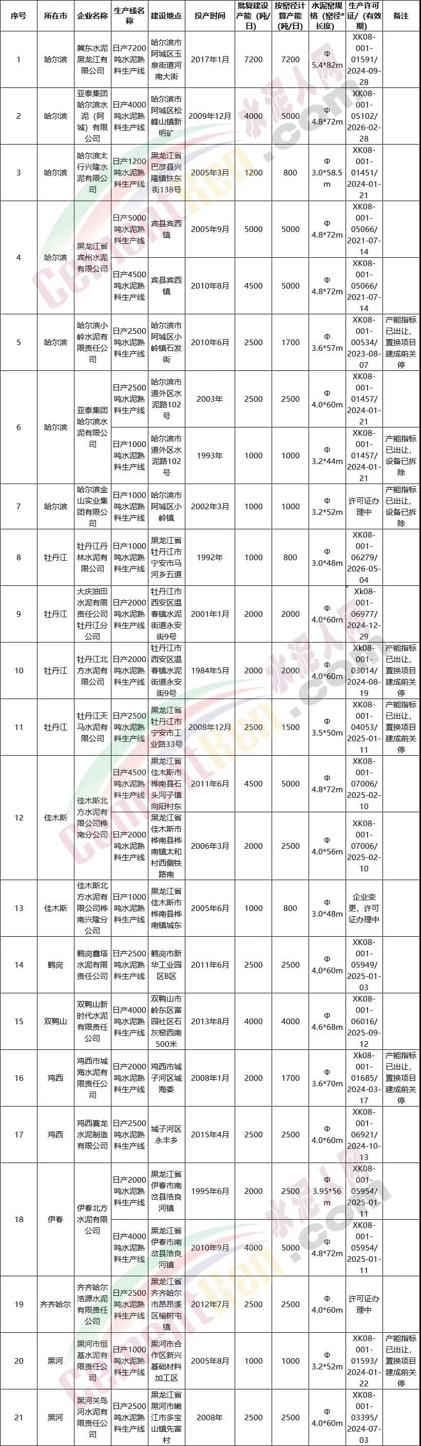 日前,黑龍江省工信廳發布水泥熟料生產線清單 。按窯徑計算,合計產能共2040萬噸。其中,產能指標已出讓,設備已拆除共兩條日產1000噸熟料生產線,按窯徑計算退出產能為60萬噸;產能指標已出讓,置換項目建成前關停共5條熟料生產線,按窯徑計算退出產能237萬噸。已退出和即將出退產能合計297萬噸。
