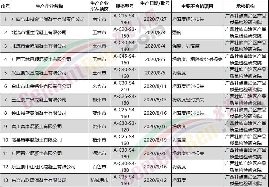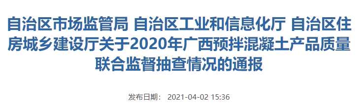 近日,廣西壯族自治區(qū)市場(chǎng)監(jiān)管局、廣西壯族自治區(qū)工業(yè)和信息化廳、廣西壯族自治區(qū)住房城鄉(xiāng)建設(shè)廳聯(lián)合發(fā)布《關(guān)于2020年廣西預(yù)拌混凝土產(chǎn)品質(zhì)量聯(lián)合監(jiān)督抽查情況的通報(bào)》。通報(bào)顯示,2020年共抽取廣西101家預(yù)拌混凝土企業(yè)生產(chǎn)的101批次產(chǎn)品,經(jīng)檢驗(yàn), 合格產(chǎn)品88批次,不合格產(chǎn)品13批次,不合格產(chǎn)品檢出率為12.9%。不合格項(xiàng)目涉及 坍落度、坍落度經(jīng)時(shí)損失、抗壓強(qiáng)度。