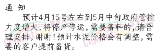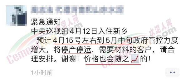 日前,有水泥經銷商在社交平臺發布“緊急通知”稱,預計4月15日到5月中旬新鄉區域將停產停運,材料價格也會隨之上漲。