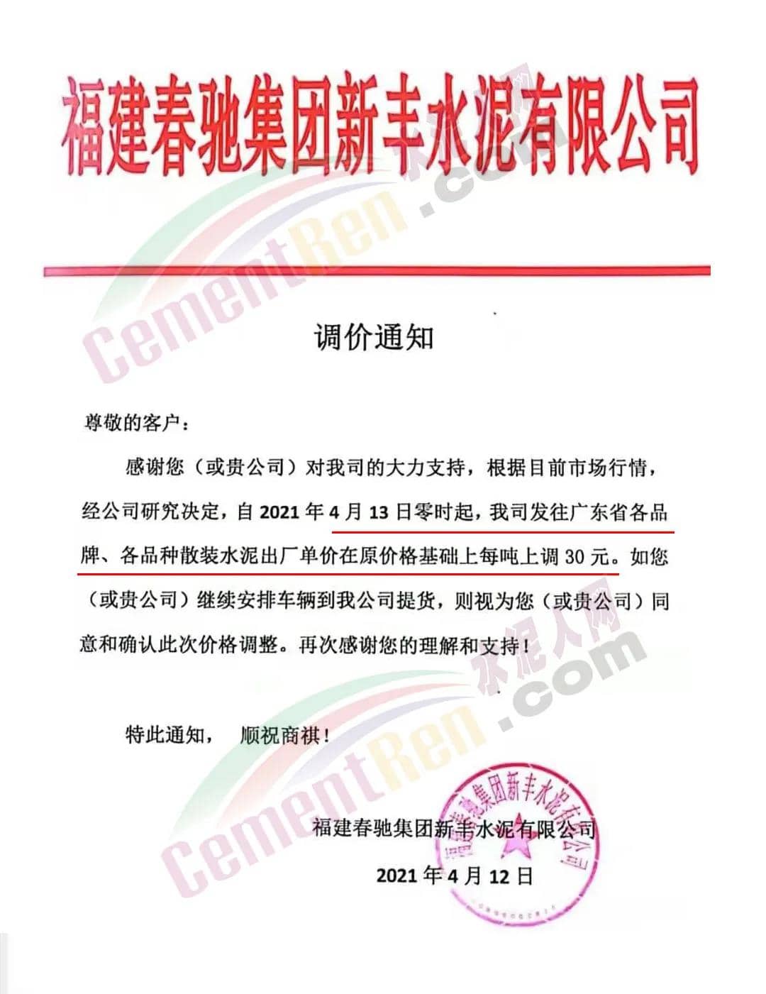 福建春馳集團新豐水泥有限公司通知自4月13日零時起,發往廣東省各品牌、各品種散裝水泥出廠單價在原價格基礎上上調30元/噸。