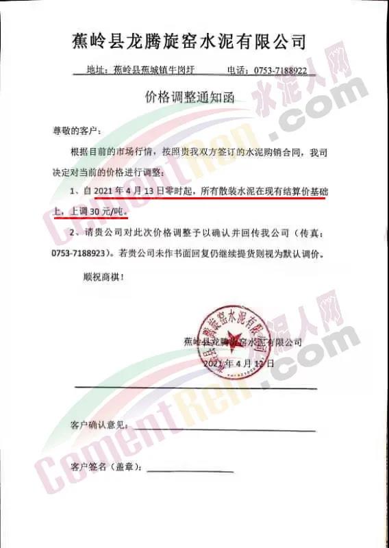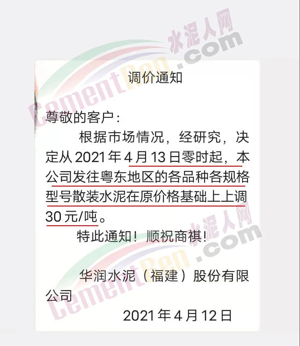華潤水泥(福建)股份有限公司通知從4月13日零時起,公司發往粵東地區的各品種各規格型號散裝水泥在原價格基礎上上調30元/噸。