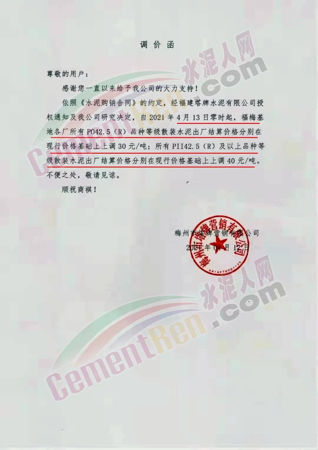 梅州市塔牌營銷有限公司通知,經福建塔牌水泥有限公司授權通知及公司研究決定,自4月13日零時起,福梅基地各廠所有PO42.5(R)品種等級散裝水泥出廠結算價格分別在現行價格基礎上上調30元/噸;所有 PII42.5(R)及以上品種等級散裝水泥出廠結算價格分別在現行價格基礎上上調40元/噸。
