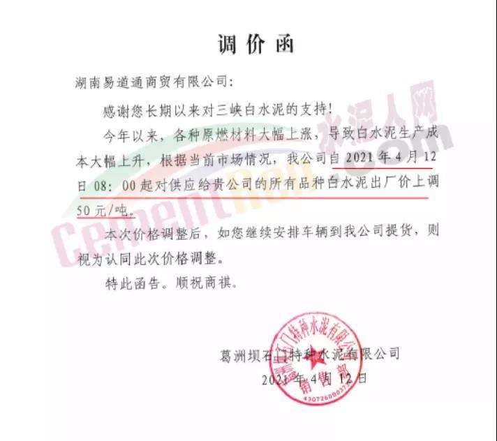 葛洲壩石門特種水泥有限公司通知今年以來,各種原燃材料大幅上漲,導致白水泥生產成本大幅上升,根據當前市場情況,自4月12日8時起起對所有品種白水泥出廠價上調50元/噸。