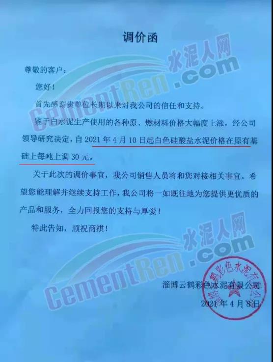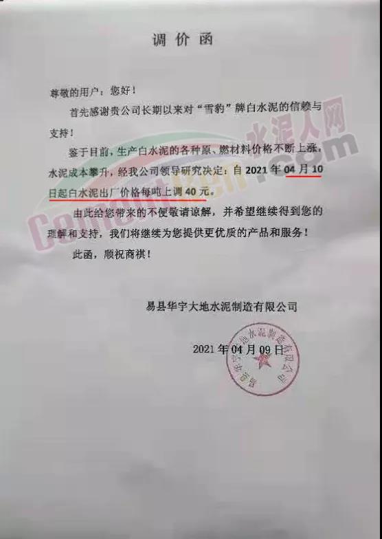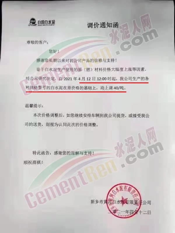 新鄉市黃河白水泥有限責任公司通知,鑒于白水泥生產使用的原(燃)材料價格大幅度上漲等因素,經公司研究決定,自4月12日12時起,公司生產的各種規格型號時白水泥在原價格的基礎上,均上調40元/噸。