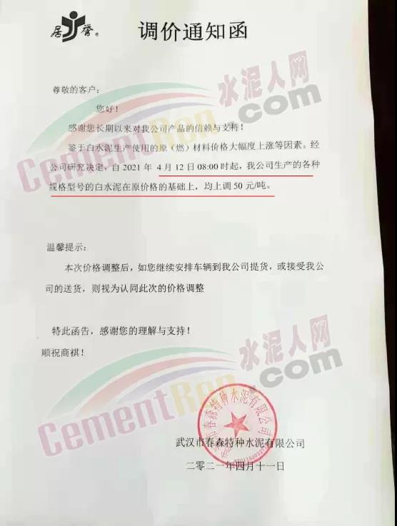 武漢市春森特種水泥有限公司通知,鑒于白水泥生產使用的原(燃)材料價格大幅度上漲等因素。經公司研究決定,自4月12日8時起,公司生產的各種規格型號的白水泥在原價格的基礎上,均上調50元/噸。