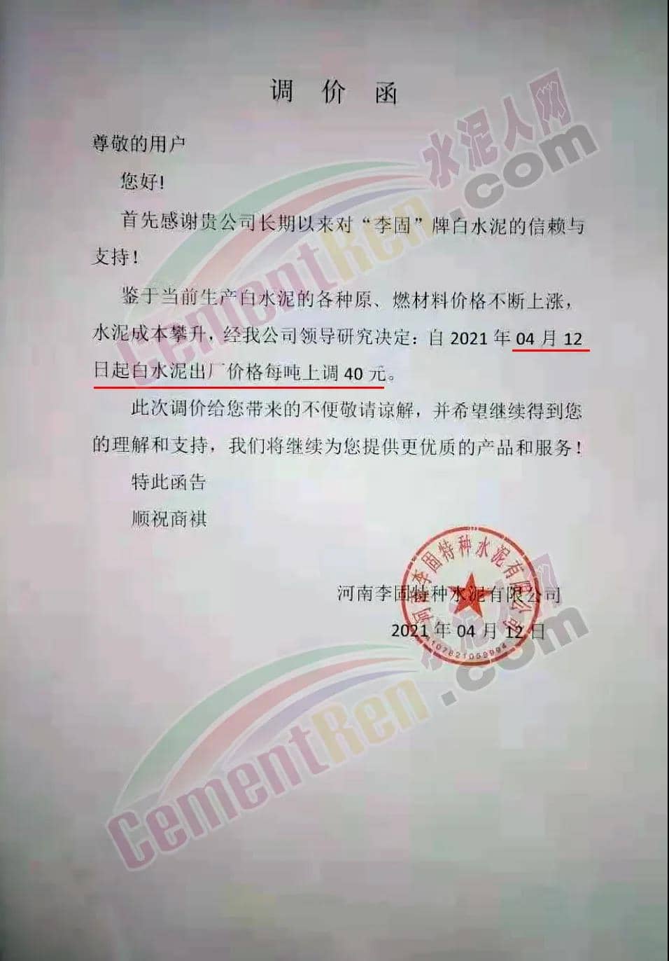 河南李固特種水泥有限公司通知,鑒于當前生產白水泥的各種原、燃材料價格不斷上漲,水泥成本攀升,經公司領導研究決定,自2021年4月12日起白水泥出廠價格上調40元/噸。
