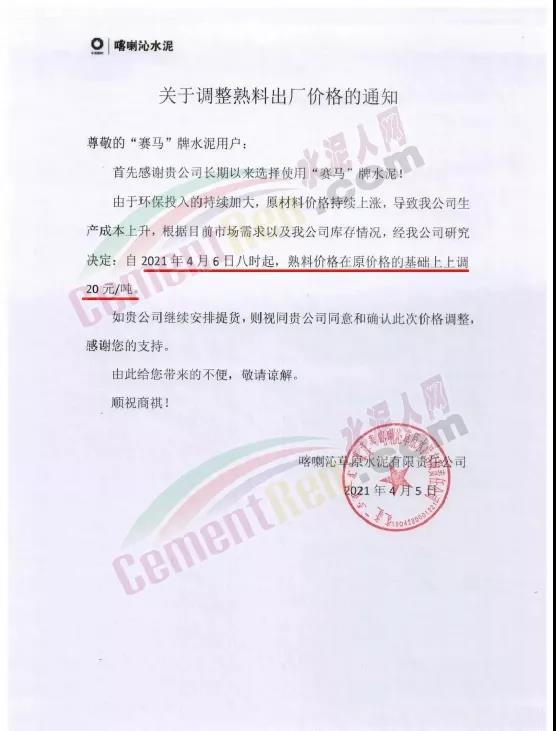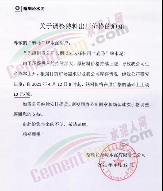 與此同時,多家特種水泥企業通知上調產品價格,其中白水泥價格上調30-100元/噸,熟料上漲100元/噸。