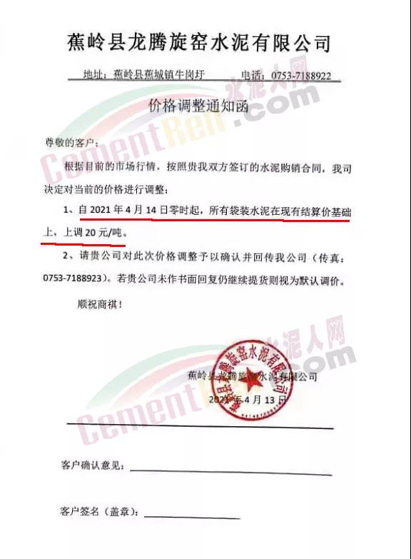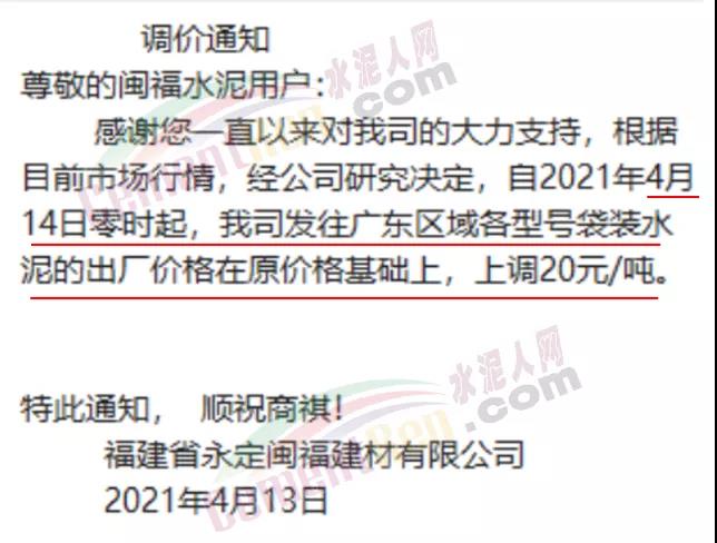 福建藍(lán)田水泥通知從4月14日零時(shí)起,發(fā)往廣東區(qū)域、福建龍巖區(qū)域的全部品牌規(guī)格袋裝水泥出廠價(jià)格上調(diào)20元/噸。