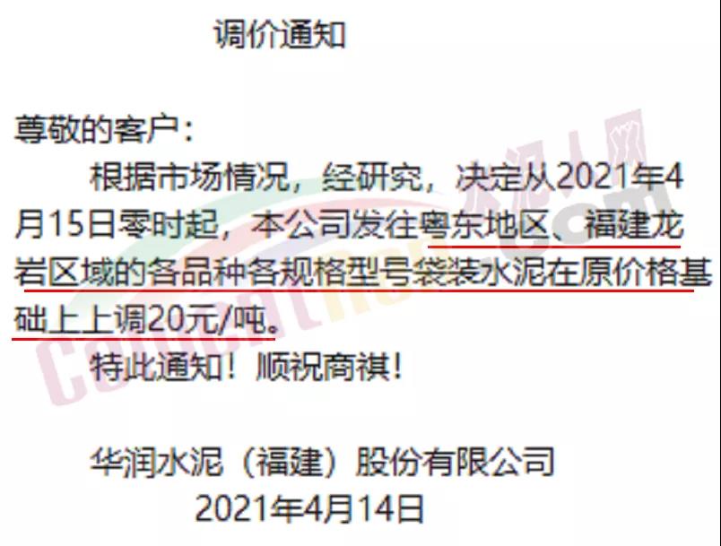 華潤水泥(福建)股份有限公司通知自4月15日零時(shí)起,公司發(fā)往粵東地區(qū)、福建龍巖區(qū)域的各品種各規(guī)格型號(hào)袋裝水泥在原價(jià)基礎(chǔ)上上調(diào)20元/噸。