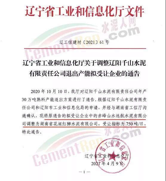 日前,遼寧省工信廳發布了《遼寧省工業和信息化廳關于調整遼陽千山水泥有限責任公司退出產能擬受讓企業的通告》稱,將原出讓方案中的擬受讓企業由赤峰山水遠航水泥有限公司調整為湖南省花垣紅獅水泥有限公司,受讓指標為750t/d。