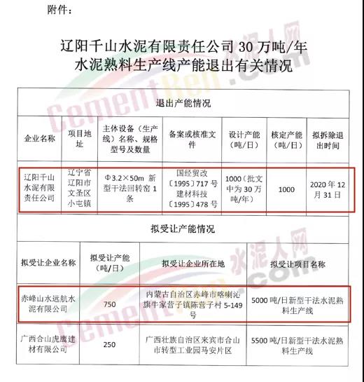 據了解,去年10月10日,遼寧省工信廳發布了《遼寧省工業和信息化廳關于遼陽千山水泥有限責任公司30萬噸/年水泥熟料產能退出的通告》對遼陽千山水泥有限責任公司30萬噸/年水泥熟料產能退出情況進行公示,赤峰山水遠航水泥有限公司及廣西合山虎鷹建材有限公司分別受讓750t/d水泥熟料產能、250t/d水泥熟料產能。