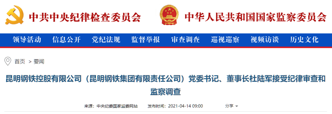 中央紀委國家監委網站訊 據云南省紀委監委消息:昆明鋼鐵控股有限公司(昆明鋼鐵集團有限責任公司)黨委書記、董事長杜陸軍涉嫌嚴重違紀違法,目前正在接受紀律審查和監察調查。