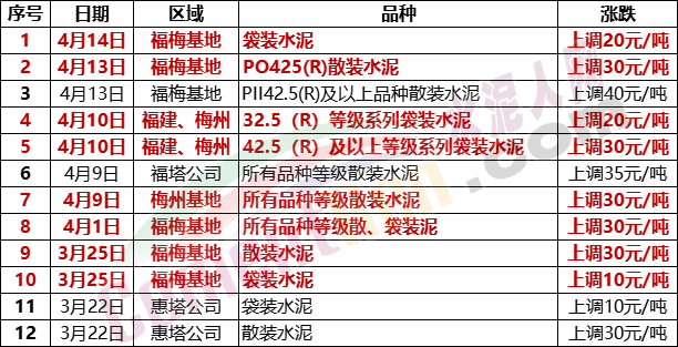 華南區(qū)域梅州市塔牌營(yíng)銷有限公司分別于3月22日、25日以及4月1日、9日、10日、13日、14日連發(fā)6份漲價(jià)通知,其中梅州基地散裝水泥累計(jì)上調(diào)達(dá)120元/噸以上,福梅基地袋裝水泥累計(jì)上調(diào)80-90元/噸。