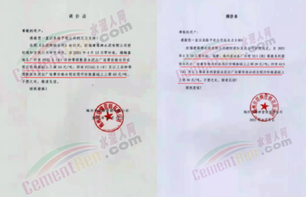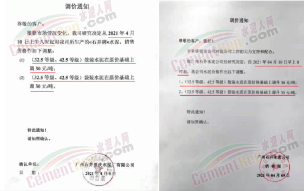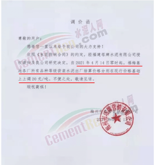 根據(jù)當(dāng)前市場(chǎng)行情,我公司于2021年3月18日早8:00對(duì)32.5袋裝水泥上調(diào)20元/噸,42.5袋裝上調(diào)20元/噸。