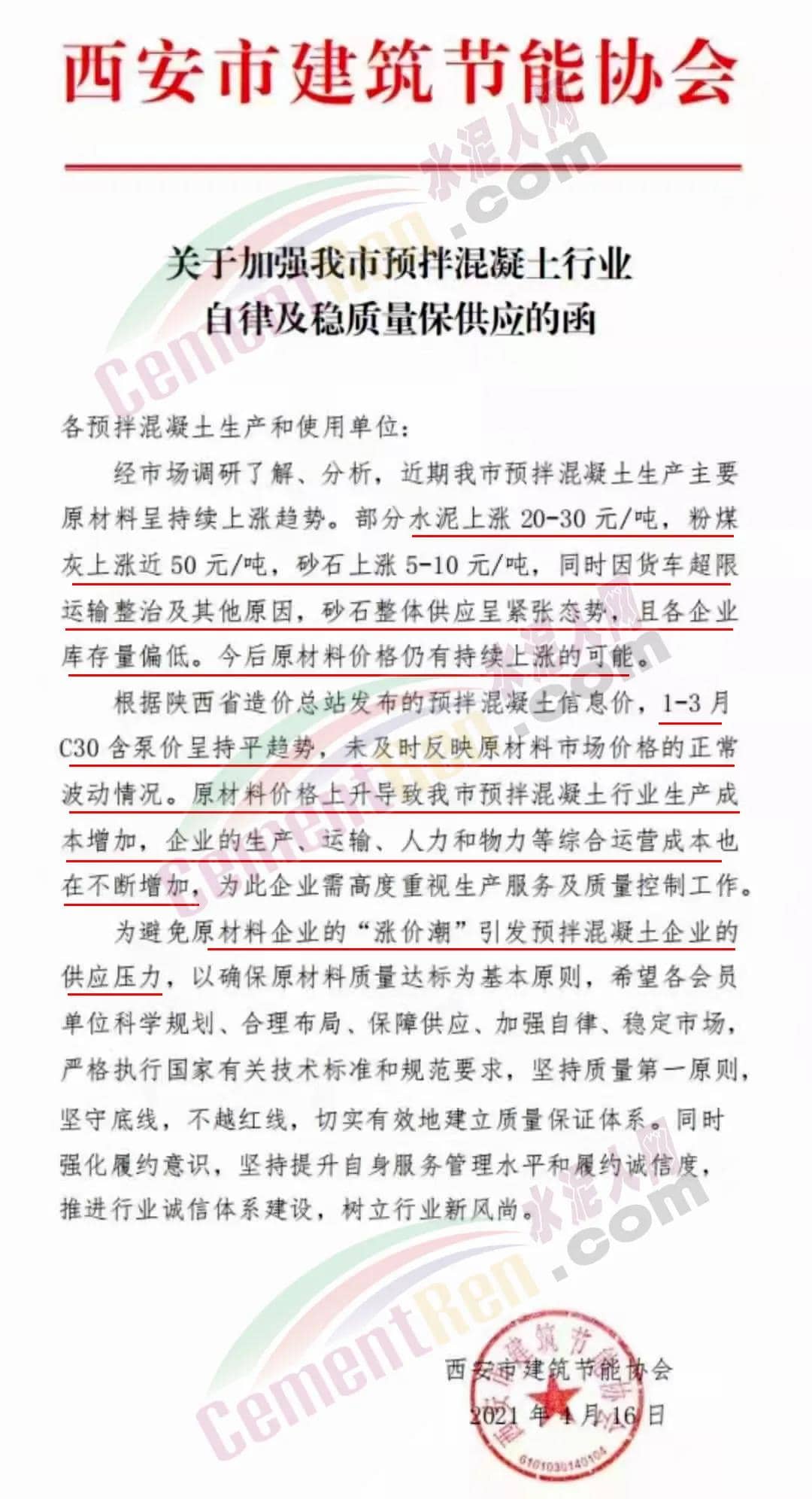 4月16日,陜西省西安市建筑節能協會發布《關于加強預拌混凝土行業自律及穩質量保供應的函》給各預拌混凝土生產和使用單位稱,經市場調研了解、分析,近期西安市預拌混凝土生產主要原材料呈持續上漲趨勢。部分水泥上漲 20-30 元/噸,粉煤灰上漲近 50 元/噸,砂石上漲 5-10 元/噸,同時因貨車超限運輸整治及其他原因,砂石整體供應呈緊張態勢,且各企業庫存量偏低。今后原材料價格仍有持續上漲的可能。