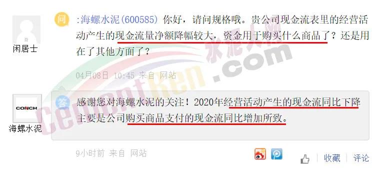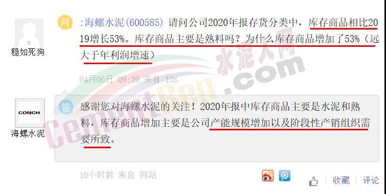 日前,有投資者在上市平臺向海螺水泥提問關于2020年報存貨分類中,庫存商品相比2019增長53%,遠大于年利潤增速相關問題。