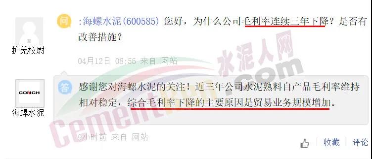 針對于海螺水泥綜合毛利率下降的原因,海螺水泥表示,近三年公司水泥熟料自產品毛利率維持相對穩定,綜合毛利率下降的主要原因是貿易業務規模增加。