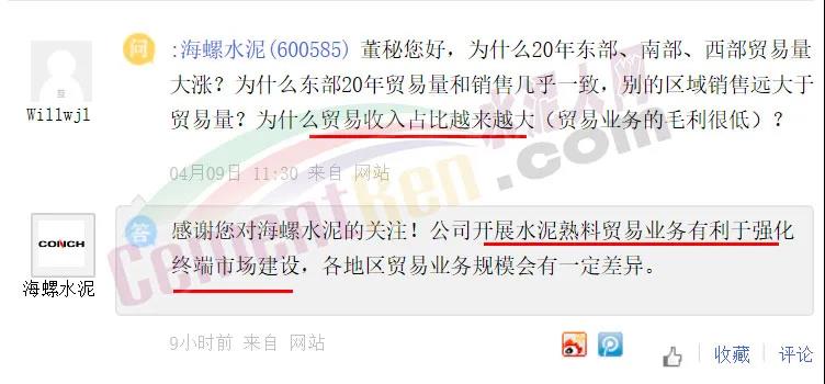 關于企業貿易量增加的問題,海螺水泥回復稱,公司開展水泥熟料貿易業務有利于強化終端市場建設。