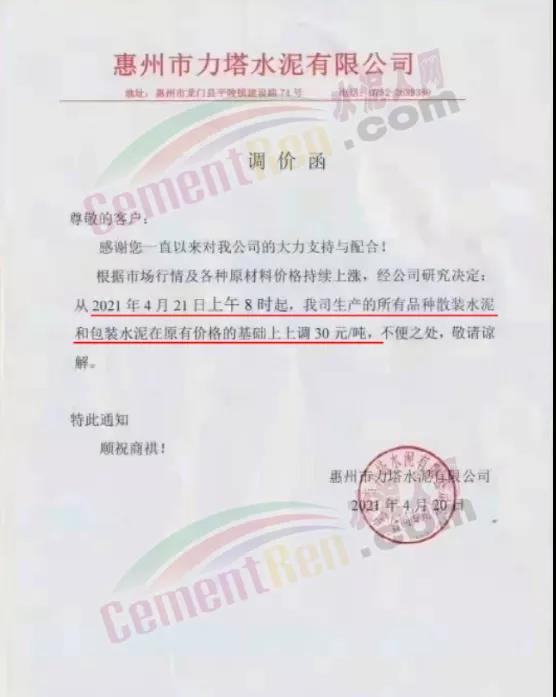 惠州市力塔水泥有限公司通知根據市場行情及各種原材料價格持續上漲,經公司研究決定從4月21日上午8時起,公司生產的所有品種散裝水泥和包裝水泥在原有價格的基礎上上調30元/噸。
