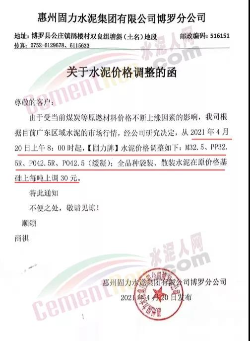 惠州固力水泥集團有限公司通知,由于受當前煤炭等原燃材料價格不斷上漲因素的影響,經公司研究決定,從4月20日上午8時起,“固力牌”水泥M32.5、PP32.5R、PO42.5R、PO42.5(緩凝),全品種袋裝、散裝水泥在原價格基礎上每噸上調30元。