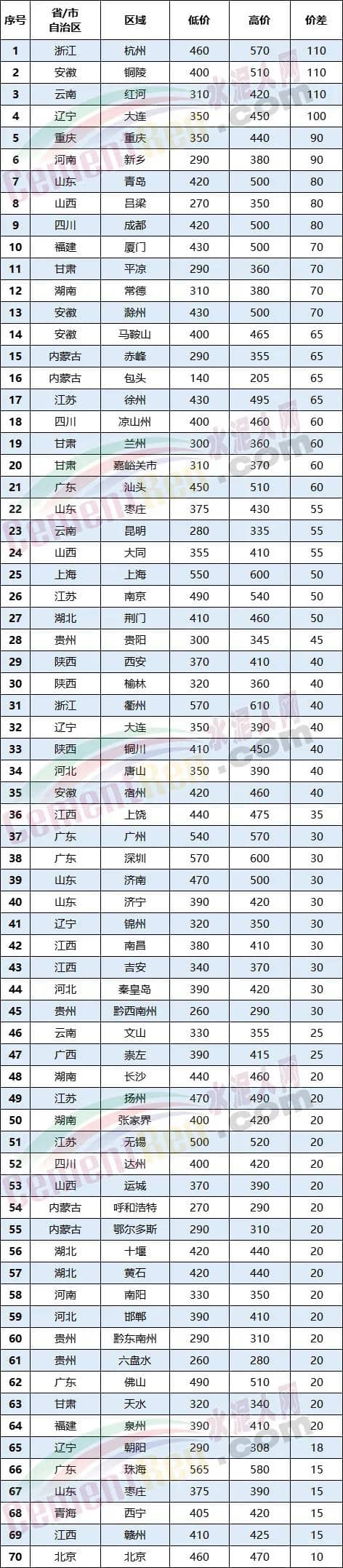 受兩大核心區域漲價輻射影響,相鄰區域紛紛發函上調水泥熟料價格。在一片漲價聲中,有一些不和諧的聲音。因部分企業未落實漲價,令區域內出現不小的價格差。從水泥人網信息中心重點監控的70個地區來看,價差最高的區域為浙江杭州、安徽銅陵、云南紅河、遼寧大連等區域,價差在100元/噸左右,最高價差在110元/噸左右。