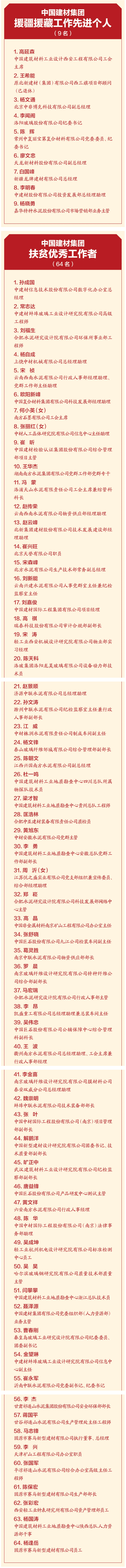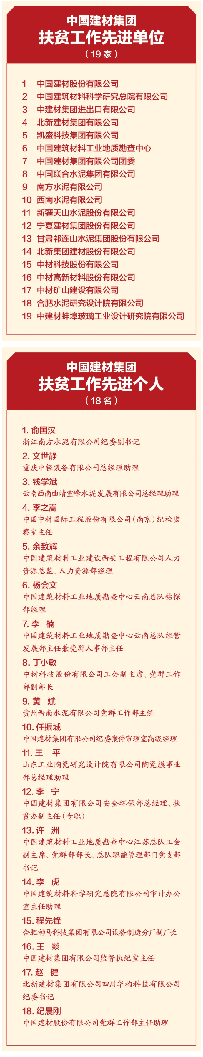 曹江林宣讀表彰決定,黨的十八大以來,集全集團之力,盡銳出戰、合力攻堅。2020年我國脫貧攻堅戰取得了全面勝利,區域性整體貧困得到解決,完成了消除絕對貧困的艱巨任務。集團定點幫扶的五個縣區已脫貧出列,援疆援藏工作也取得了階段性成果。為表彰在脫貧攻堅及援疆援藏工作中涌現出的先進個人和先進集體,充分展現脫貧攻堅成效成果,經集團黨委研究決定:授予中國建材股份有限公司等19家成員企業“扶貧工作先進單位”稱號,授予俞國漢等18名同志“扶貧工作先進個人”稱號,授予高延森等9名同志“援疆援藏工作先進個人”稱號,授予孫成國等64名同志“扶貧優秀工作者”稱號。