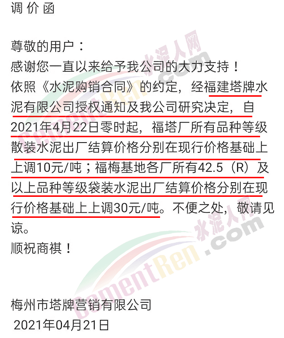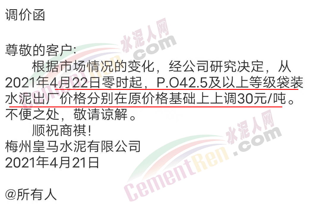 4月21日梅州皇馬水泥有限公司通知根據市場情況的變化,經公司研究決定,從 2021年4月22日零時起,P.O42.5及以上等級袋裝水泥出廠價格分別在原價格基礎上上調30元/噸。