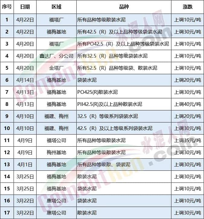 河北唐山豐潤區水泥經銷商通知:豐潤區非引領性水泥廠,將于4月22日零時停產到4月30日24時,停產8天,有引領性名譽的水泥廠正常生產。同時,區域內部分企業已經率先通知上調水泥價格。