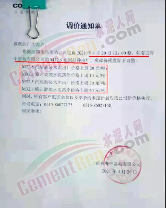 南京海中貿易有限公司通知自4月20日12時起,對南京海中貿易有限公司 M32.5水泥品種出廠、離岸價上調15-20元/噸。