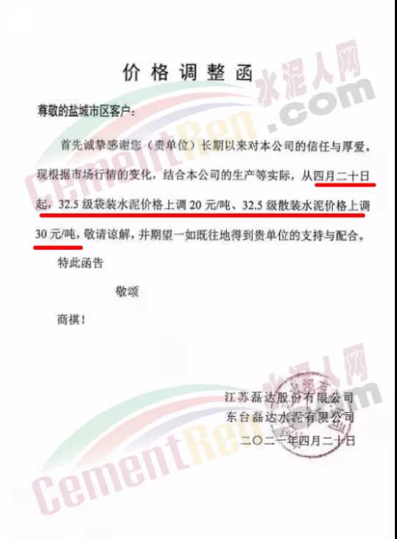 江蘇磊達股份有限公司東臺磊達水泥有限公司通知從4月20日起,32.5級袋裝水泥價格上調 20元/噸,散裝水泥上調30元/噸。