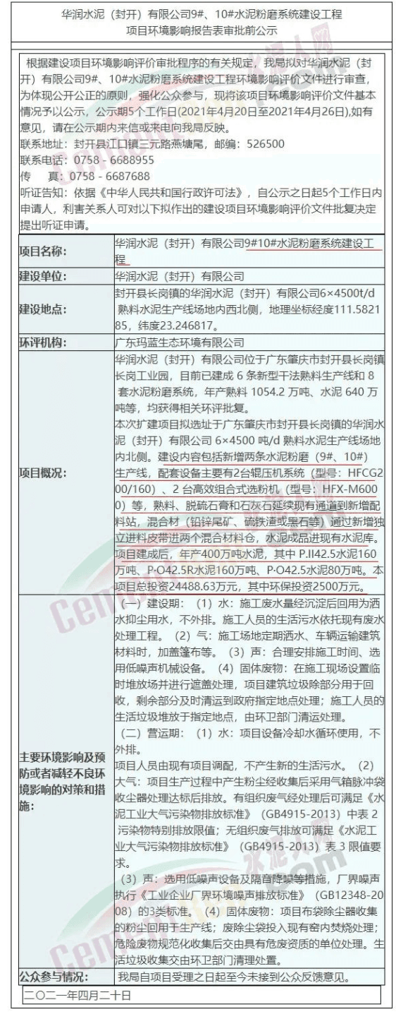 4月20日,廣東省肇慶市生態環境局肇慶封開分局發布《華潤水泥(封開)有限公司9#、10#水泥粉磨系統建設工程項目環境影響報告表審批前公示》提到華潤水泥(封開)有限公司次將新建兩條水泥粉磨(9#、10#)生產線。