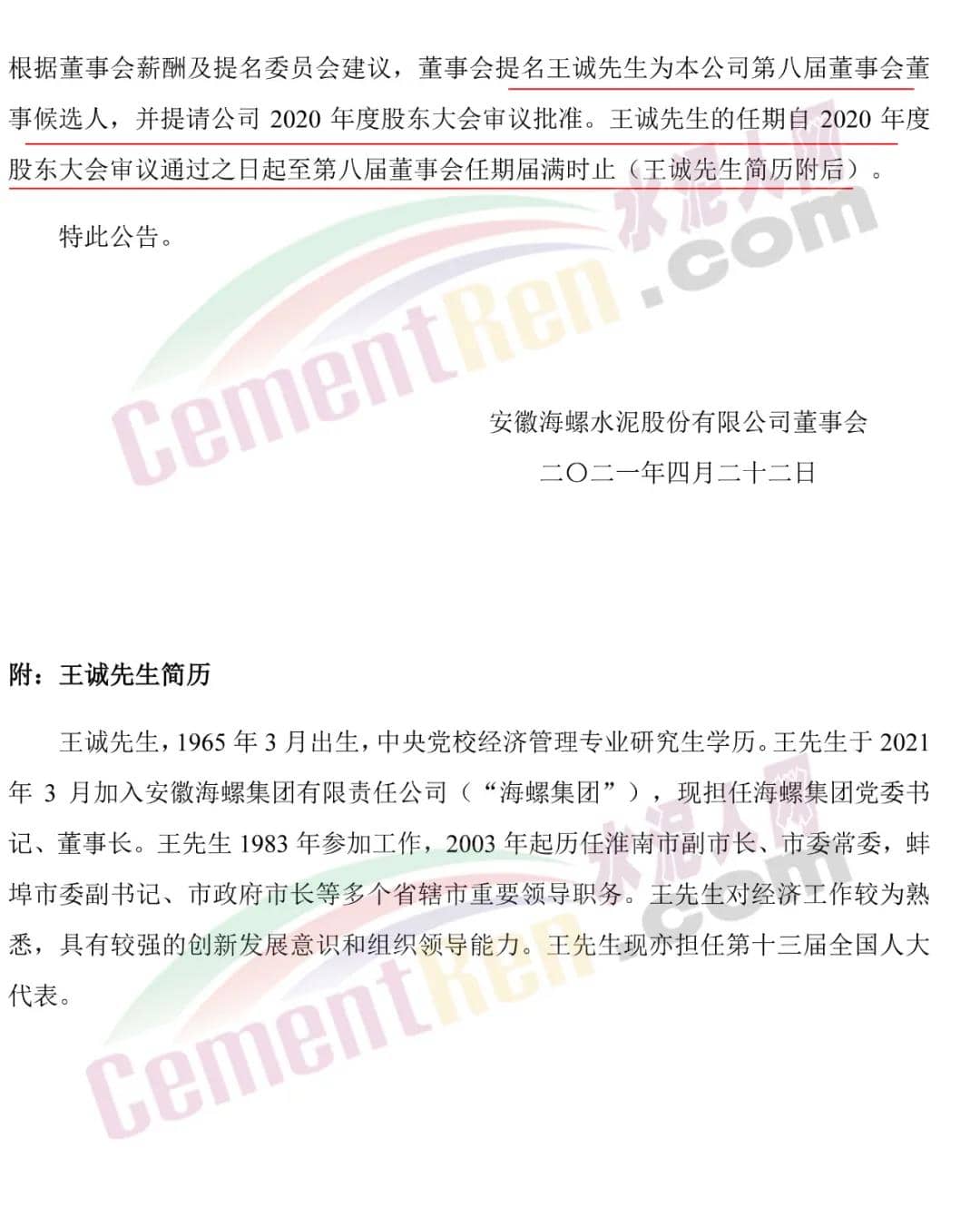王先生于 2021年 3 月加入安徽海螺集團有限責任公司(“海螺集團”),現擔任海螺集團黨委書記、董事長。