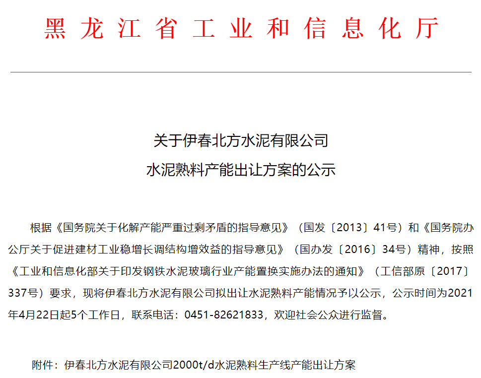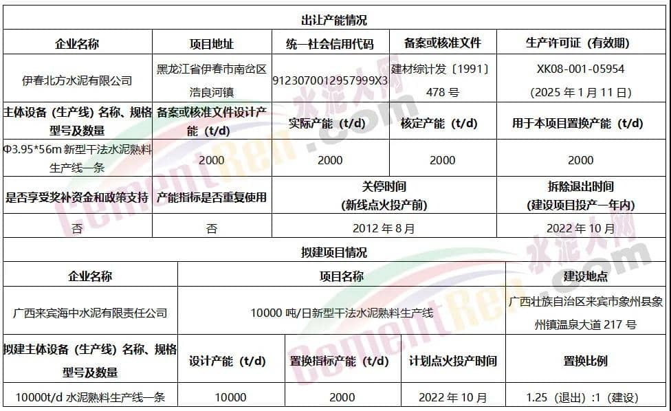 日前,黑龍江工信廳發(fā)布《關于伊春北方水泥有限公司 2000t/d水泥熟料生產(chǎn)線產(chǎn)能出讓方案的公示》公示內(nèi)容顯示,伊春北方水泥有限公司退出位于黑龍江省伊春市南岔區(qū)浩良河鎮(zhèn)的一條2000t/d新型干法水泥熟料生產(chǎn)線,用于在廣西壯族自治區(qū)來賓市象州縣新建一條10000t/d新型干法水泥熟料生產(chǎn)線。新線計劃點火投產(chǎn)時間為2022年10月,置換比例為1.25(退出):1(建設),受讓企業(yè)為廣西來賓海中水泥有限責任公司。
