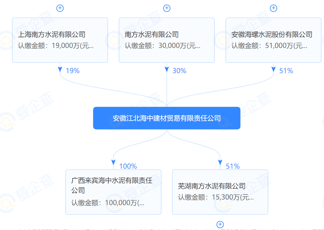 其股東信息顯示,發(fā)起股東為安徽江北海中建材貿(mào)易有限責任公司。股權穿透圖顯示,安徽江北海中建材貿(mào)易有限責任公司股東為上海南方水泥、南方水泥和安徽海螺水泥合資公司三家企業(yè)。