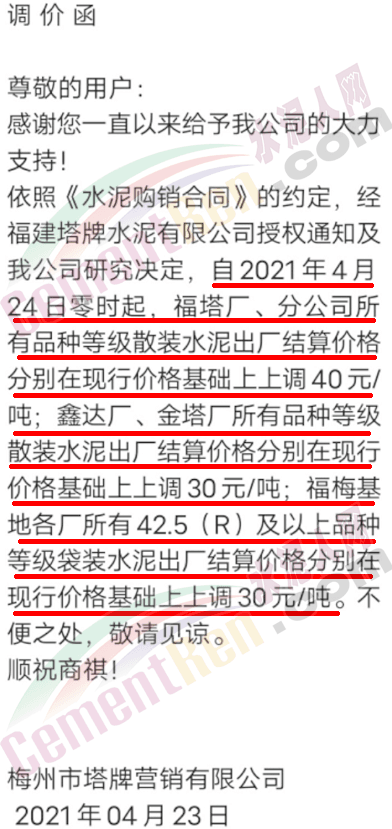 梅州市塔牌營銷有限公司通知,依照《水泥購銷合同》的約定,經(jīng)福建塔牌水泥有限公司授權(quán)通知及我公司研究決定,自4月24日零時(shí)起,福塔廠、分公司所有品種等級散裝水泥出廠結(jié)算價(jià)格分別在現(xiàn)行價(jià)格基礎(chǔ)上上調(diào)40元/噸;鑫達(dá)廠、金塔廠所有品種等級散裝水泥出廠結(jié)算價(jià)格分別在現(xiàn)行價(jià)格基礎(chǔ)上上調(diào)30元/噸;福梅基地各廠所有42.5(R)及以上品種等級袋裝水泥出廠結(jié)算價(jià)格分別在現(xiàn)行價(jià)格基礎(chǔ)上上調(diào)30元/噸。
