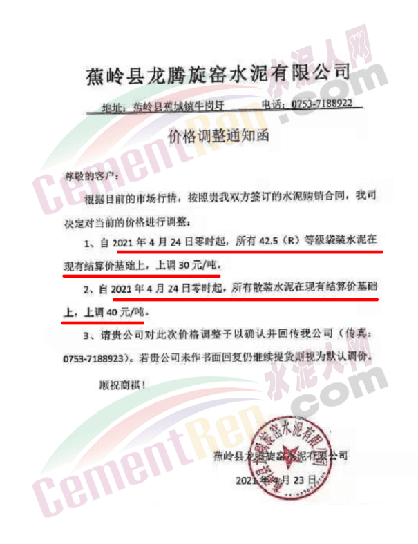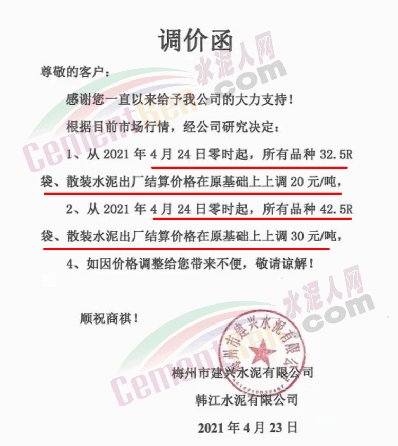 梅州皇馬水泥有限公司通知,從2021年4月24日零時(shí)起,P.O42.5及以上等級袋裝水泥出廠單價(jià)分別在原價(jià)格基礎(chǔ)上上調(diào)30元/噸;P.O42.5及以上等級散裝水泥出廠單價(jià)分別在原價(jià)格基礎(chǔ)上上調(diào)40元/噸。