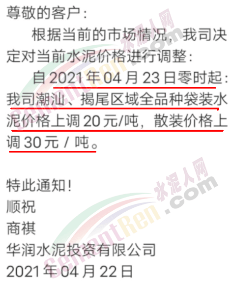 華潤水泥投資有限公司通知自4月23日零時(shí)起,公司潮汕、揭尾區(qū)域全品種袋裝水泥價(jià)格上調(diào)20元/噸,散裝價(jià)格上調(diào)30元/噸。