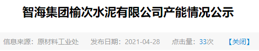 日前,山西省工信廳發布《智海集團榆次水泥有限公司產能情況公示》稱,按照相關文件要求現將智海集團榆次水泥有限公司產能情況予以公示。