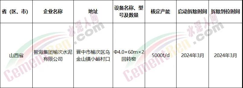 退出產能情況顯示,智海集團榆次水泥有限公司退出位于晉中市榆次區烏金山鎮小峪村的Φ4.0×60m×2回轉窯(核定產能5000t/d)并將于2024年3月啟動拆除。