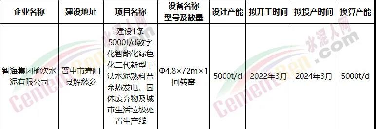 建設項目情況顯示,智海集團榆次水泥有限公司將在晉中市壽陽縣解愁鄉區域內建設1條5000t/d數字化智能化綠色化二代新型干法水泥熟料帶余熱發電、固體廢棄物及城市生活垃圾處置生產線, 關鍵設備為Φ4.8×72m×1回轉窯(設計產能5000t/d)擬開工時間2022年3月,并將于2024年3月投產,置換比例1:1。