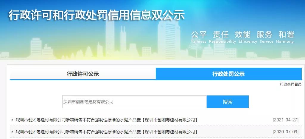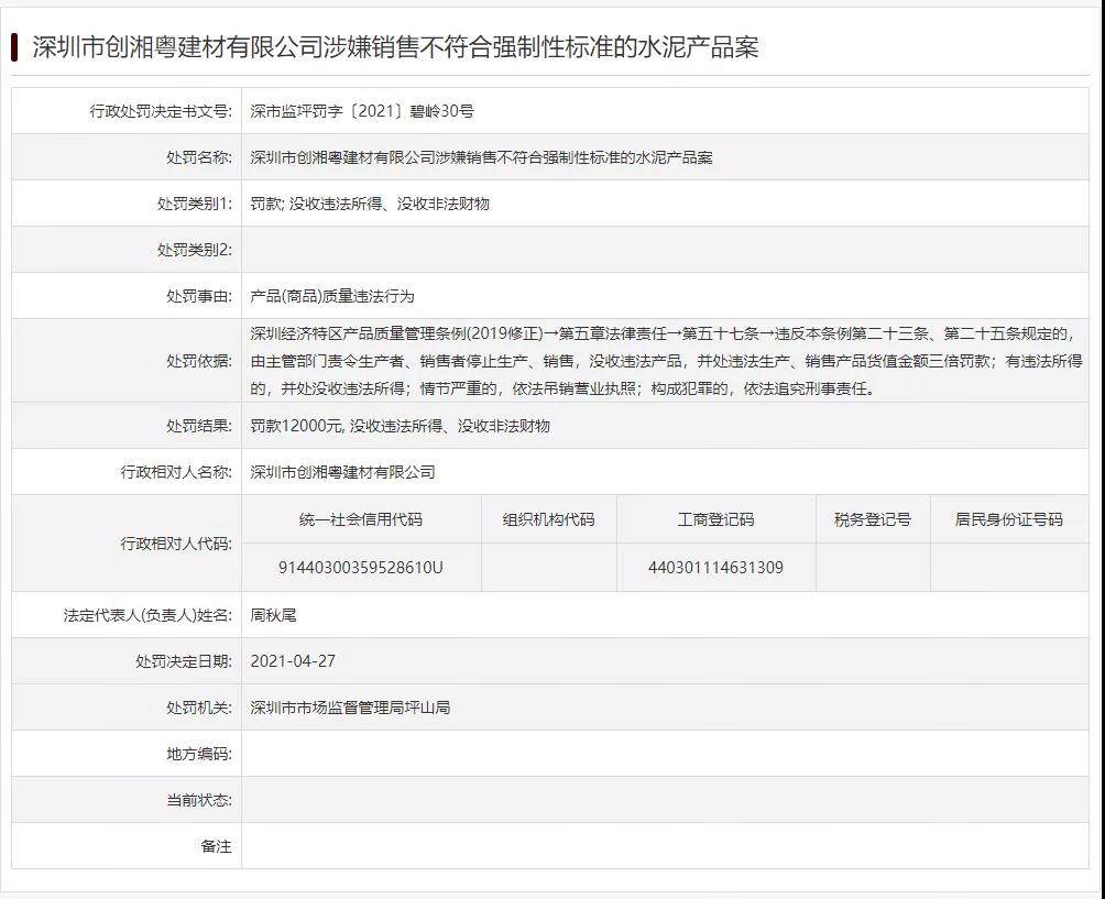 日前,深圳市市場監督管理局坪山局對深圳市創湘粵建材有限公司涉嫌銷售不符合強制性標準的水泥產品案作出行政處罰決定,罰款12000元,沒收違法所得、沒收非法財物。行政處罰決定書文號為深市監坪罰字〔2021〕碧嶺30號。