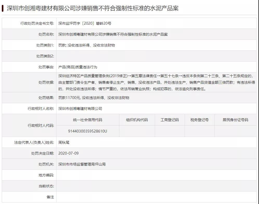 據查詢,坪山市場監管局曾于2020年7月9日對該企業進行行政處罰,罰款金額11700,沒收違法所得和非法財務11700 。且處罰原因同樣也是涉嫌銷售不符合強制性標準的水泥產品。