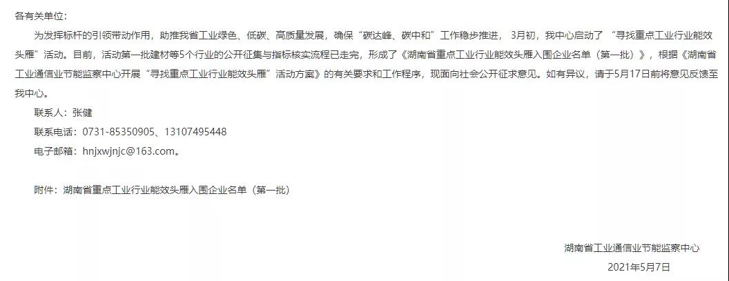湖南省重點(diǎn)工業(yè)行業(yè)能效頭雁入圍企業(yè)名單(第一批)