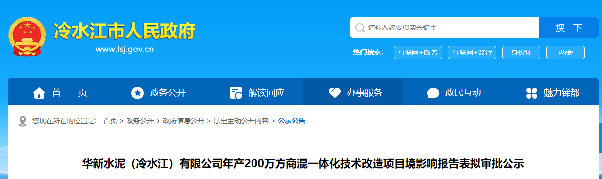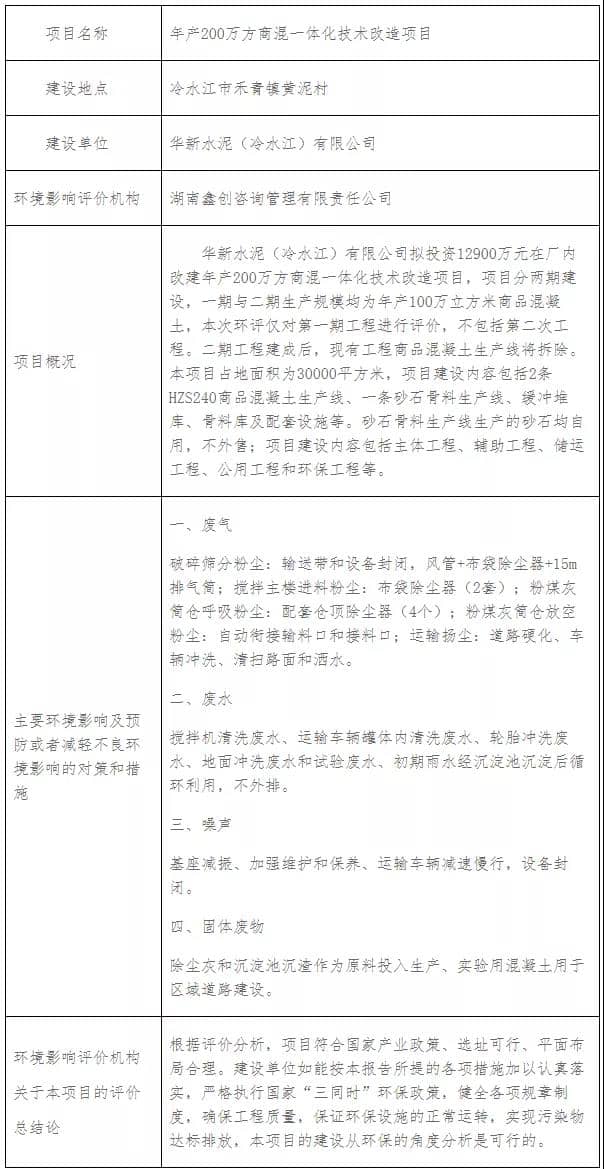 近日,華新水泥(冷水江)有限公司年產(chǎn)200萬(wàn)方商混一體化技術(shù)改造項(xiàng)目境影響報(bào)告表擬審批公示。從公示得知,華新水泥(冷水江)有限公司擬投資12900萬(wàn)元在廠內(nèi)改建年產(chǎn)200萬(wàn)方商混一體化技術(shù)改造項(xiàng)目,項(xiàng)目分兩期建設(shè),一期與二期生產(chǎn)規(guī)模均為年產(chǎn)100萬(wàn)立方米商品混凝土,本次環(huán)評(píng)僅對(duì)第一期工程進(jìn)行評(píng)價(jià),不包括第二次工程。