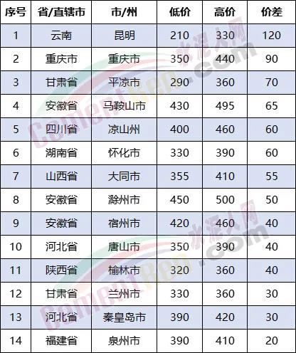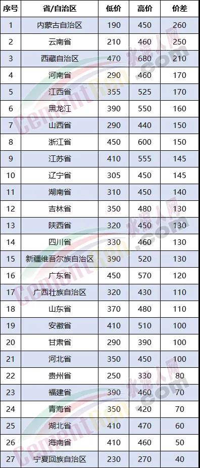 從各個省自治區不同企業報價差距來看,價差從40~260元/噸不等,其中內蒙、西藏、云南、河南、江西、黑龍江、山西、浙江、江蘇等21個省、自治區價差均在100元/噸以上。