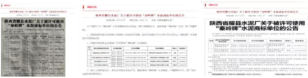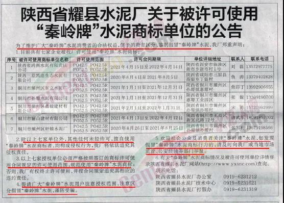 日前,陜西省耀縣水泥廠發布《關于被許可使用"秦嶺牌"水泥商標單位的公告》稱:為了維護廣大“秦嶺牌”水泥消費者的合法權益,便于消費者區分、鑒別假冒“秦嶺牌”水泥。工廠鄭重聲明:目前共有七家企業被陜西省耀縣水泥廠許可使用“秦嶺牌”水泥商標。除已授權的七家單位外,其他任何未經許可,擅自使用“秦嶺牌”水泥商標者,均構成侵權行為,企業將依法追究其侵權責任。