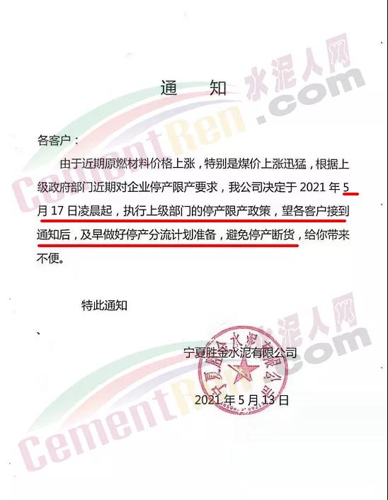 水泥人網(wǎng)通訊員消息:5月13日,寧夏勝金水泥有限公司通知,由于近期原燃材料價(jià)格上漲,特別是煤價(jià)上漲迅猛,根據(jù)上級(jí)政府部門(mén)近期對(duì)企業(yè)停產(chǎn)限產(chǎn)要求,公司決定于2021年5月17日凌晨起,執(zhí)行上級(jí)部門(mén)的停產(chǎn)限產(chǎn)政策,望各客戶接到通知后,及早做好停產(chǎn)分流計(jì)劃準(zhǔn)備,避免停產(chǎn)斷貨。