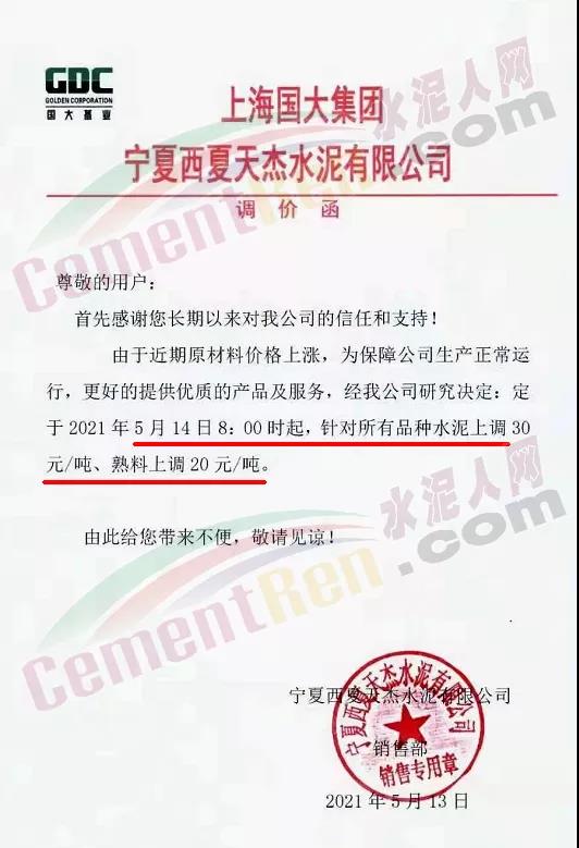 同日,烏海賽馬有限責(zé)任公司通知,因近期大宗原燃材料持續(xù)上漲,導(dǎo)致公司生產(chǎn)成本大幅攀升,經(jīng)公司研究決定,自2021年5月14日0時(shí)起,各品種水泥及油井水泥價(jià)格在原價(jià)格基礎(chǔ)上上調(diào)30元/噸。