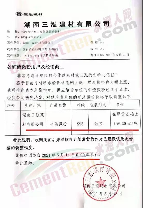 同期,湖南多家礦粉企業(yè)通知上調(diào)礦粉價(jià)格。湖南三泓建材有限公司通知稱因原材料價(jià)格不斷上漲,成本急劇增加,經(jīng)公司研究決定,從2021年5月14日開(kāi)始,對(duì)所有區(qū)域礦粉價(jià)格在原來(lái)基礎(chǔ)上上調(diào)30元/噸。