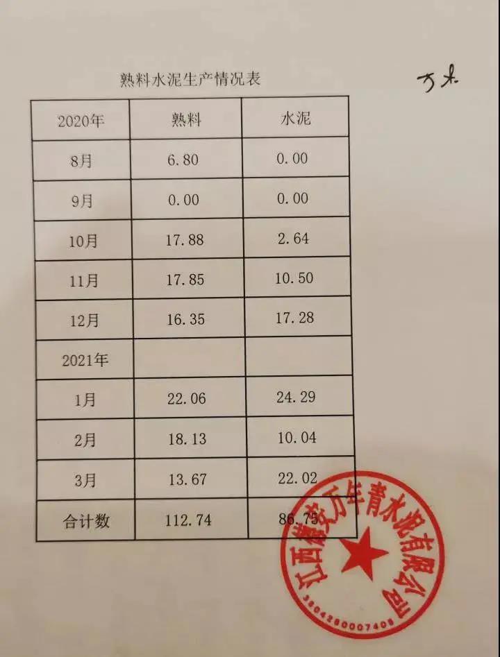 圖2 德安萬年青水泥有限公司熟料生產臺賬。截至今年3月底,已累計生產水泥熟料112.74萬噸